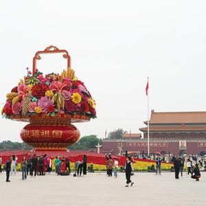 中秋及國慶節假期日益臨近,北京天安門廣場的“祝福祖國”巨型花籃及長安街沿線立體花壇精彩亮相,吸引游人及市民觀賞留念。