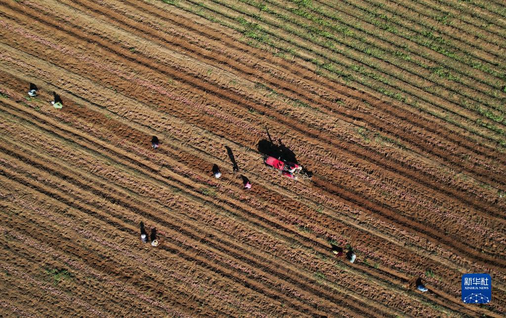 9月25日,河北省盧龍縣盧龍鎮一家紅薯種植合作社的社員在收獲紅薯(無人機照片)。