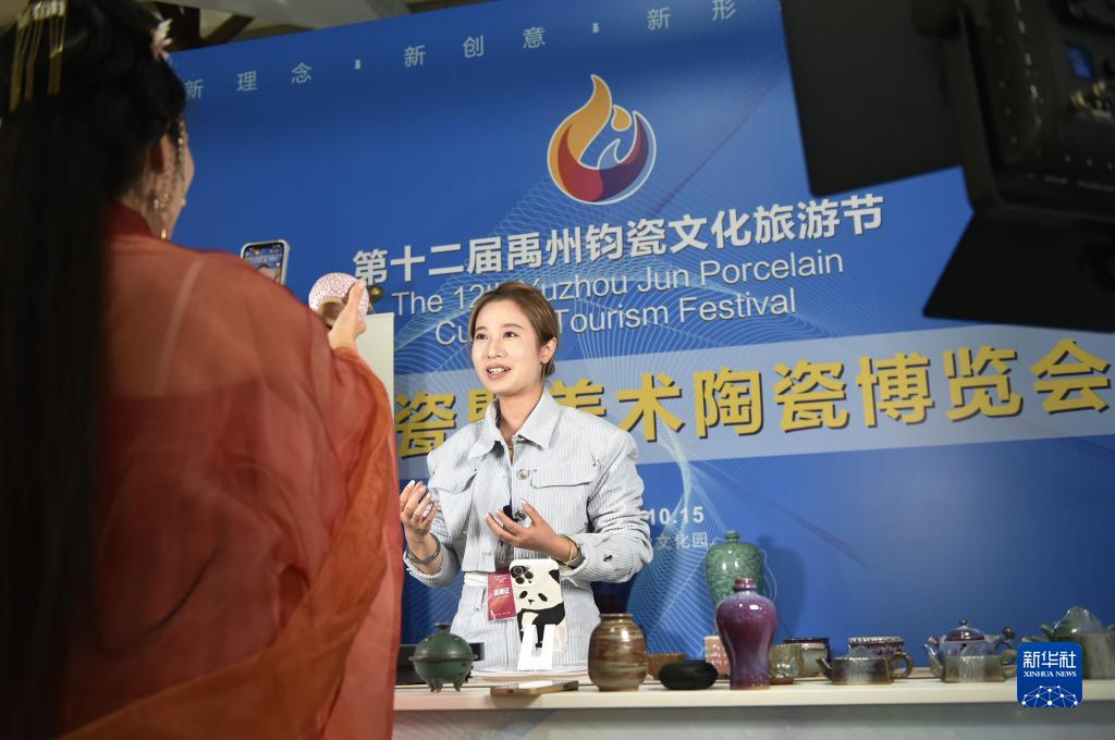 9月25日,工作人員在禹州市神垕鈞瓷工業文化園內舉辦的中國鈞瓷暨美術陶瓷博覽會現場進行直播,推介鈞瓷產品。