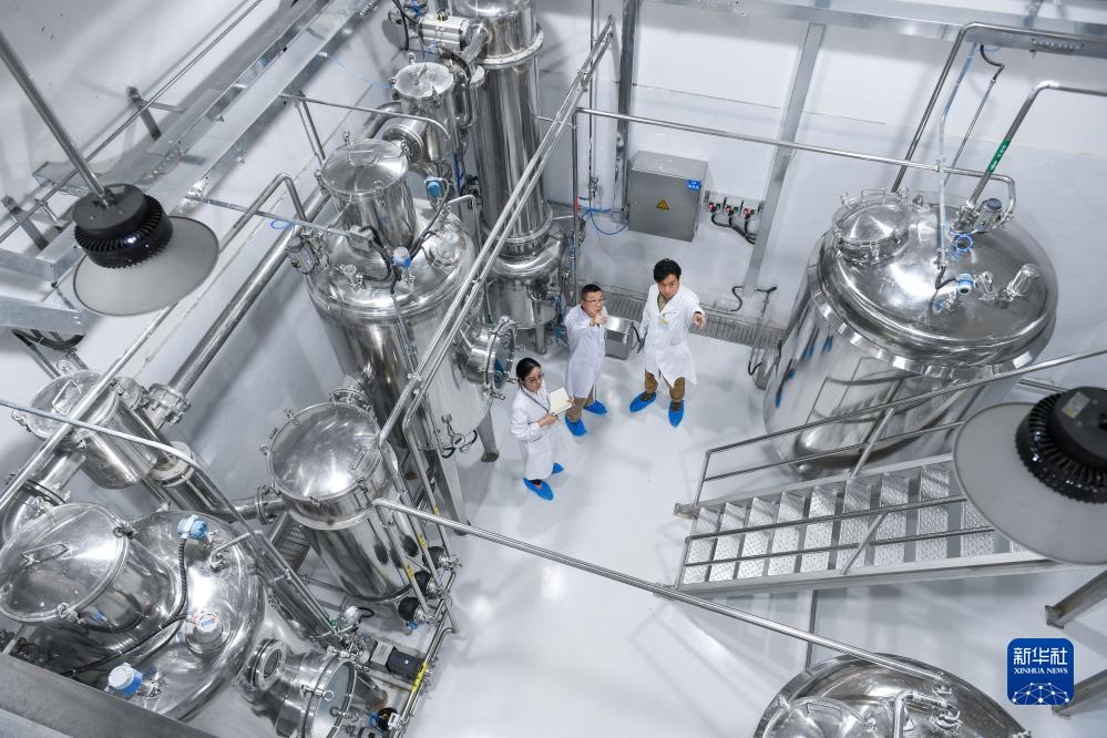 9月4日,在深圳光明國際中醫藥港的粵港醫療機構中藥院內制劑中心,郭鈞泯(右)和同事查看即將投入使用的設備情況。