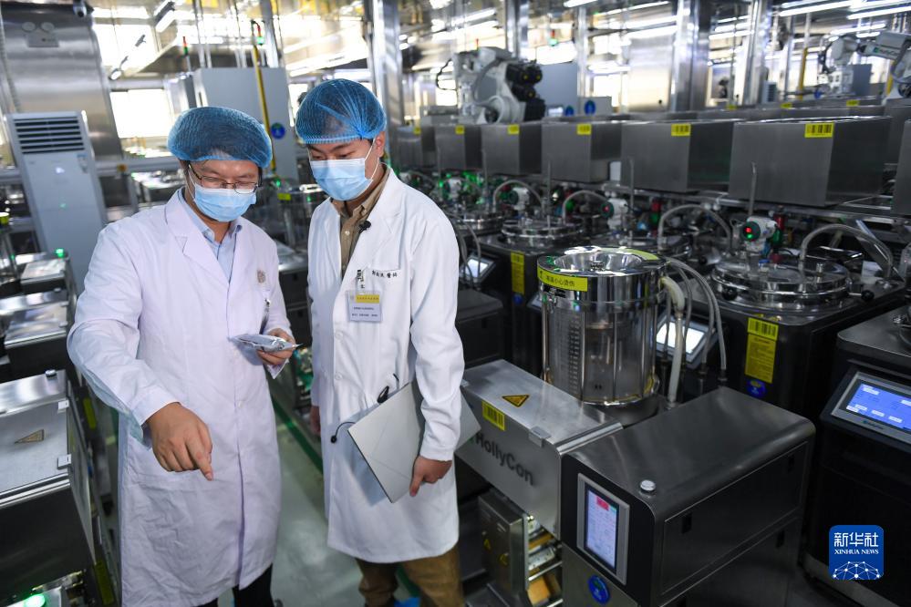9月4日,在深圳光明國際中醫藥港的中藥飲片代煎代配中心,郭鈞泯(右)和同事查看自動煎藥系統運行情況。
