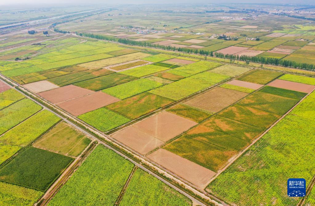 這是內蒙古巴彥淖爾市臨河區城關鎮使用節水技術灌溉的農田(無人機照片,9月14日攝)。