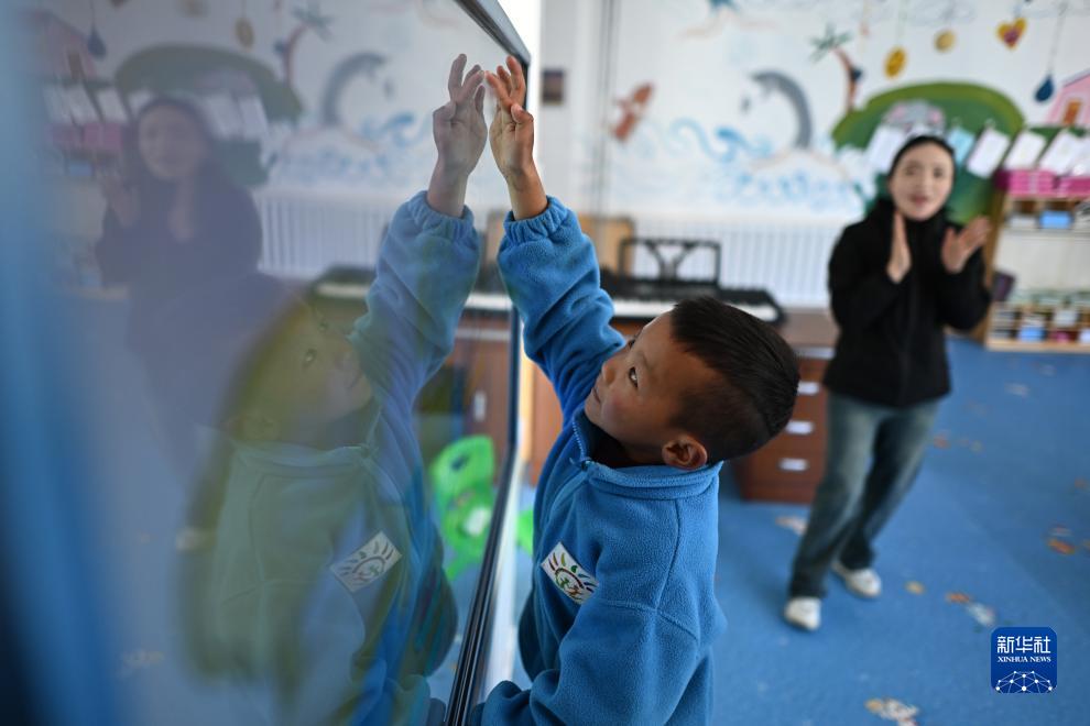 在曲麻萊縣秋智鄉幼兒園,更尕多杰(左)在課堂上玩游戲(9月13日攝)。