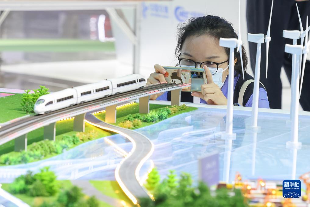 9月26日,一名參觀者在中國交建的展臺拍攝。