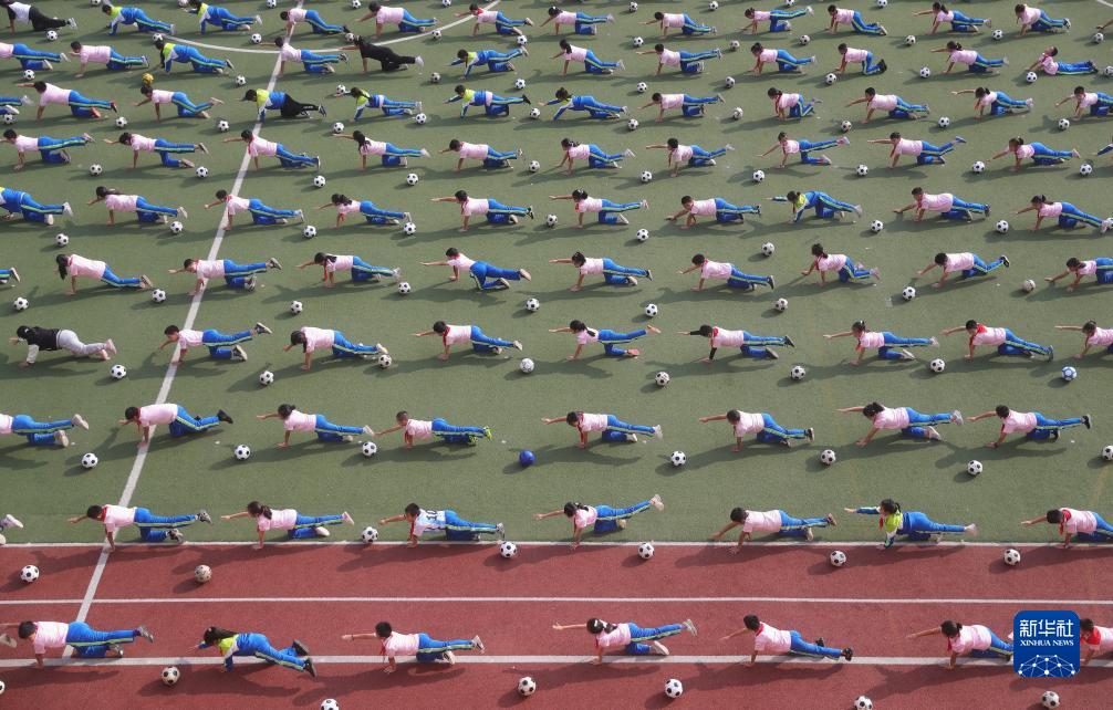 9月26日,河北省秦皇島市海港區耀華小學的學生在大課間練習足球操。