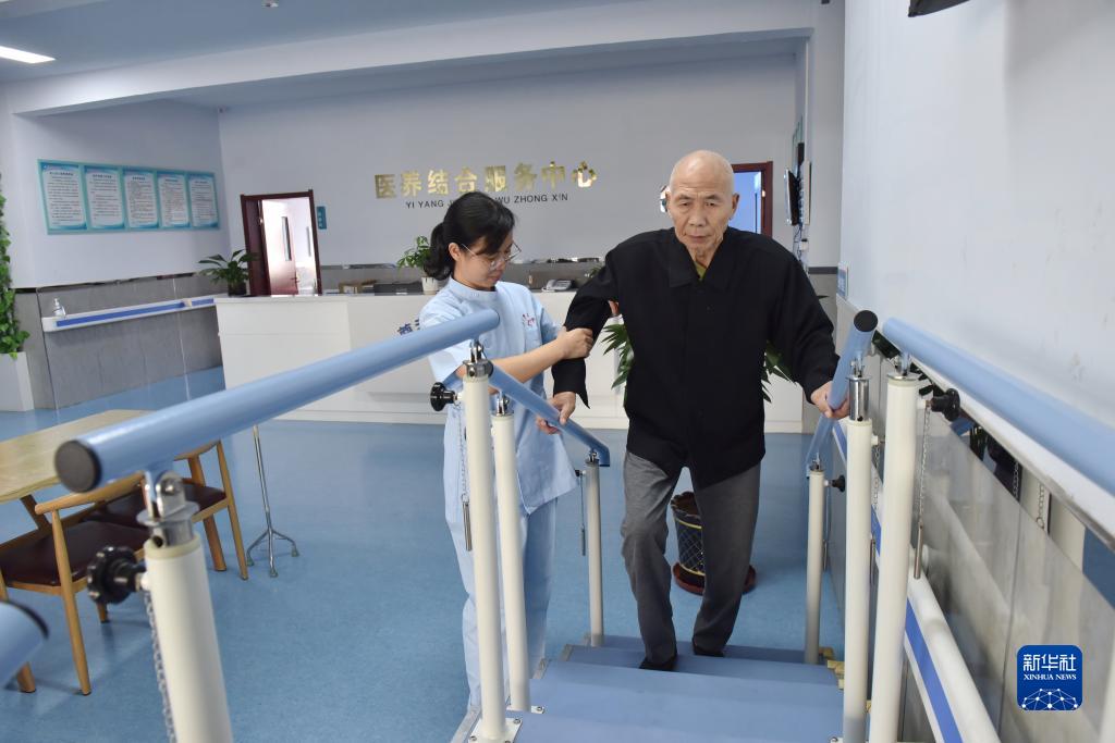 9月26日,邢臺市南和區史召鄉衛生院醫養中心工作人員指導老人進行康復訓練。