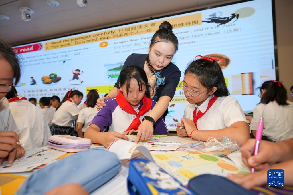 9月26日,在重慶鐵路小學英語教學交流課上,城口縣蓼子鄉第一中心小學的一名學生代表(前左二)和鐵路小學的學生們一起進行課堂英語練習。
