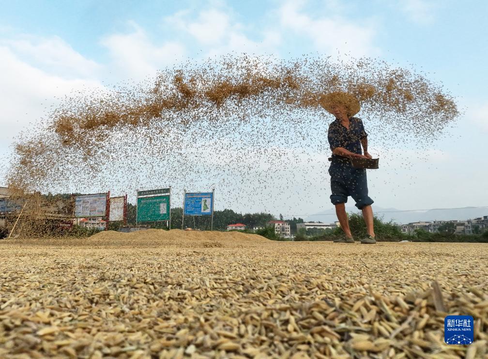 9月25日,湖南省衡陽市衡陽縣關市鎮的農民在晾曬稻谷。