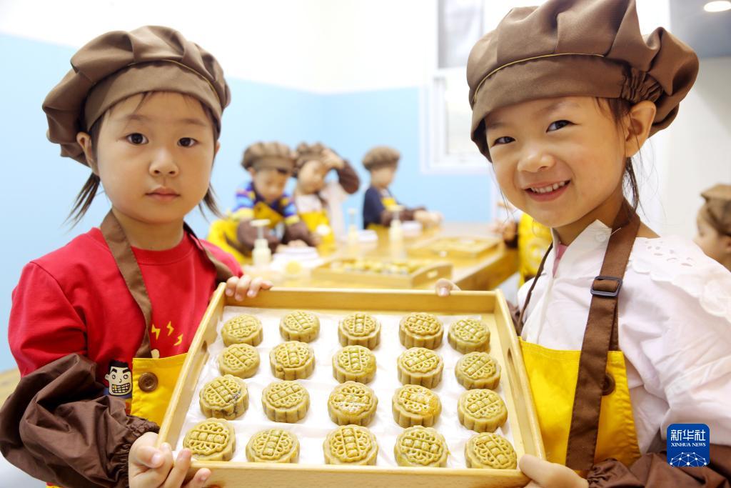 9月26日,在江蘇省連云港市一家幼兒園,小朋友展示自己動手制作的月餅。
