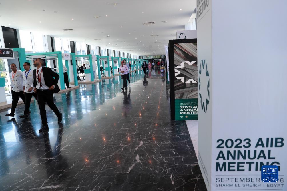 9月26日,在埃及沙姆沙伊赫,參會者走過亞投行第八屆理事會年會的展板。