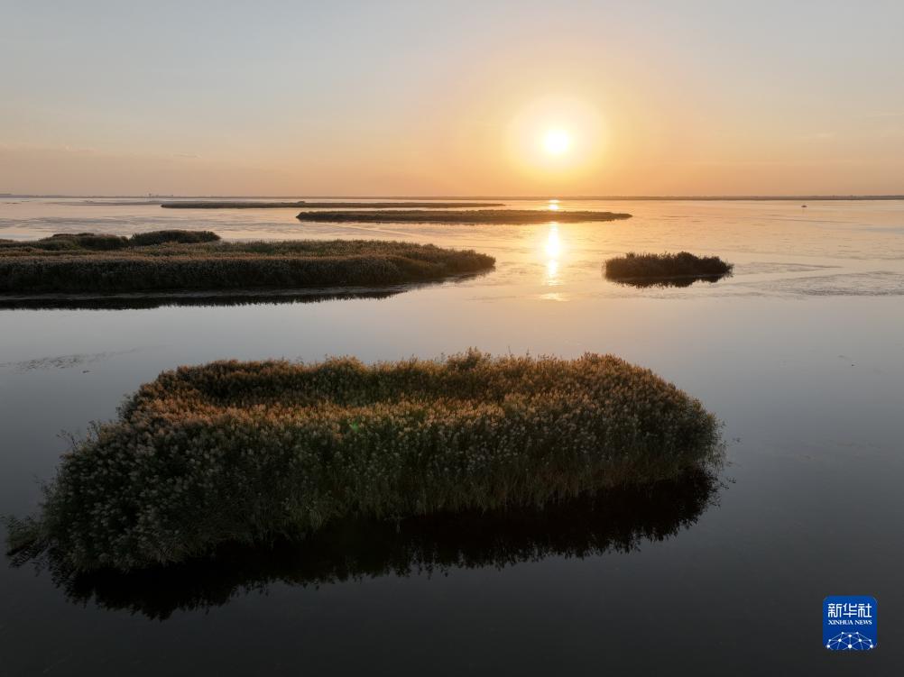 烏梁素海落日美景(無人機照片,9月13日攝)。