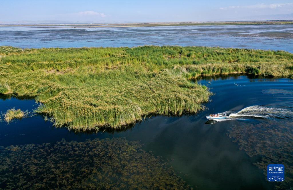 9月15日,在烏梁素海湖面上,武蓉、馮琛和劉瑩慧乘坐快艇去采集湖水樣本(無人機照片)。