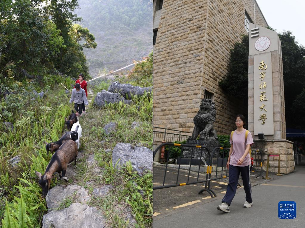 這是一張拼版照片,左圖為:在廣西都安瑤族自治縣拉烈鎮崇業村弄后屯,藍曉萍(后)和妹妹藍云萍放學回家后放羊(2015年4月14日攝);右圖為:在廣西南寧師范大學,藍曉萍放學后走出校門(2023年9月26日攝)。
