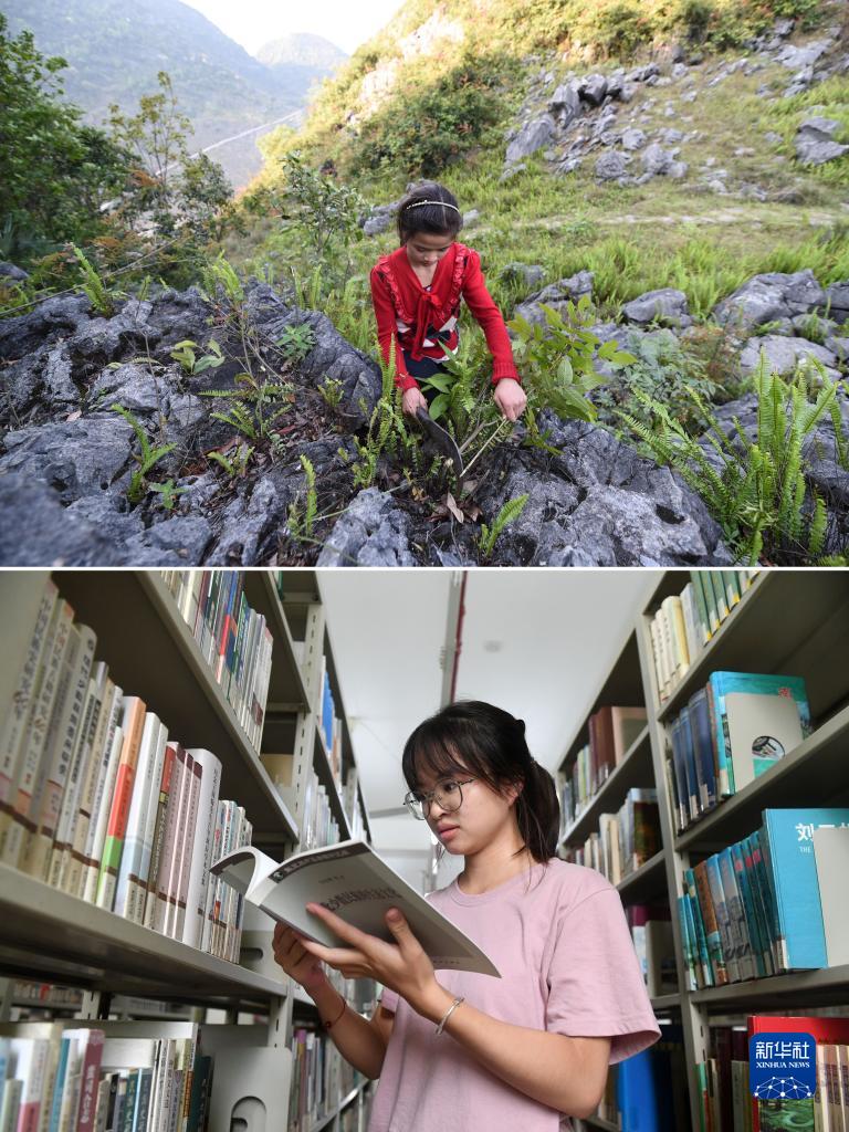 這是一張拼版照片,上圖為:在廣西都安瑤族自治縣拉烈鎮崇業村弄后屯,藍曉萍放學回家后在山上一邊放羊一邊砍柴(2015年4月14日攝);下圖為:在廣西南寧師范大學,藍曉萍在圖書館里看書(2023年9月26日攝)。