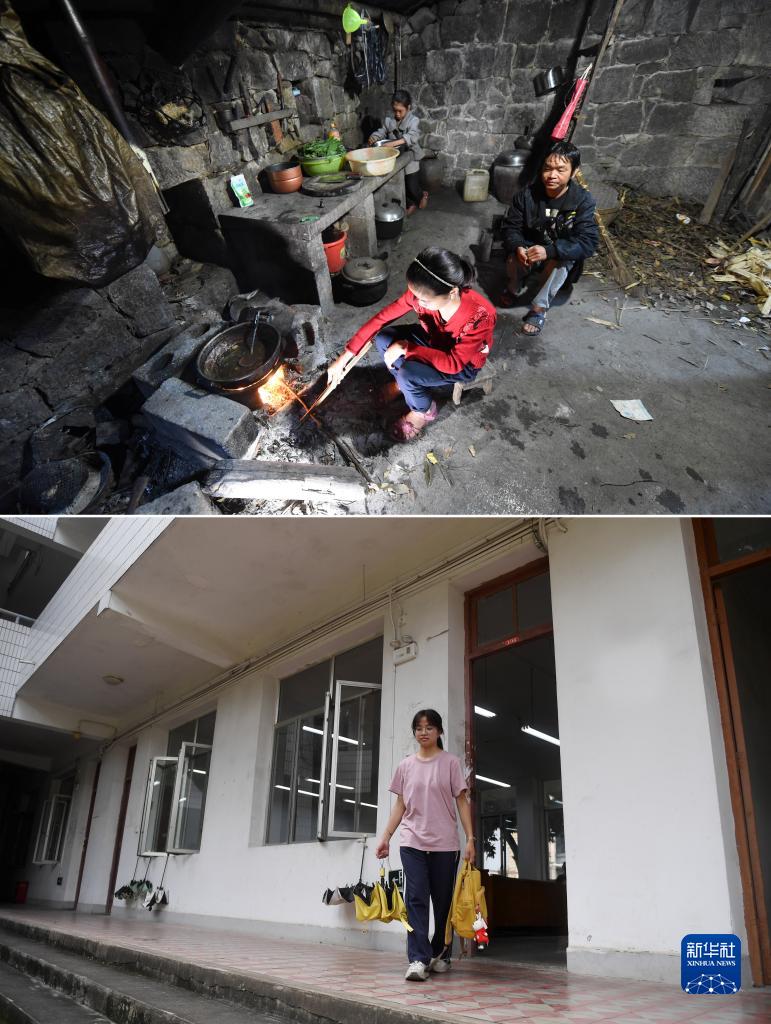 這是一張拼版照片,上圖為:在廣西都安瑤族自治縣拉烈鎮崇業村弄后屯,藍曉萍(前)在為父親和妹妹準備早飯(2015年4月14日攝);下圖為:在廣西南寧師范大學,藍曉萍走出教室(2023年9月26日攝)。