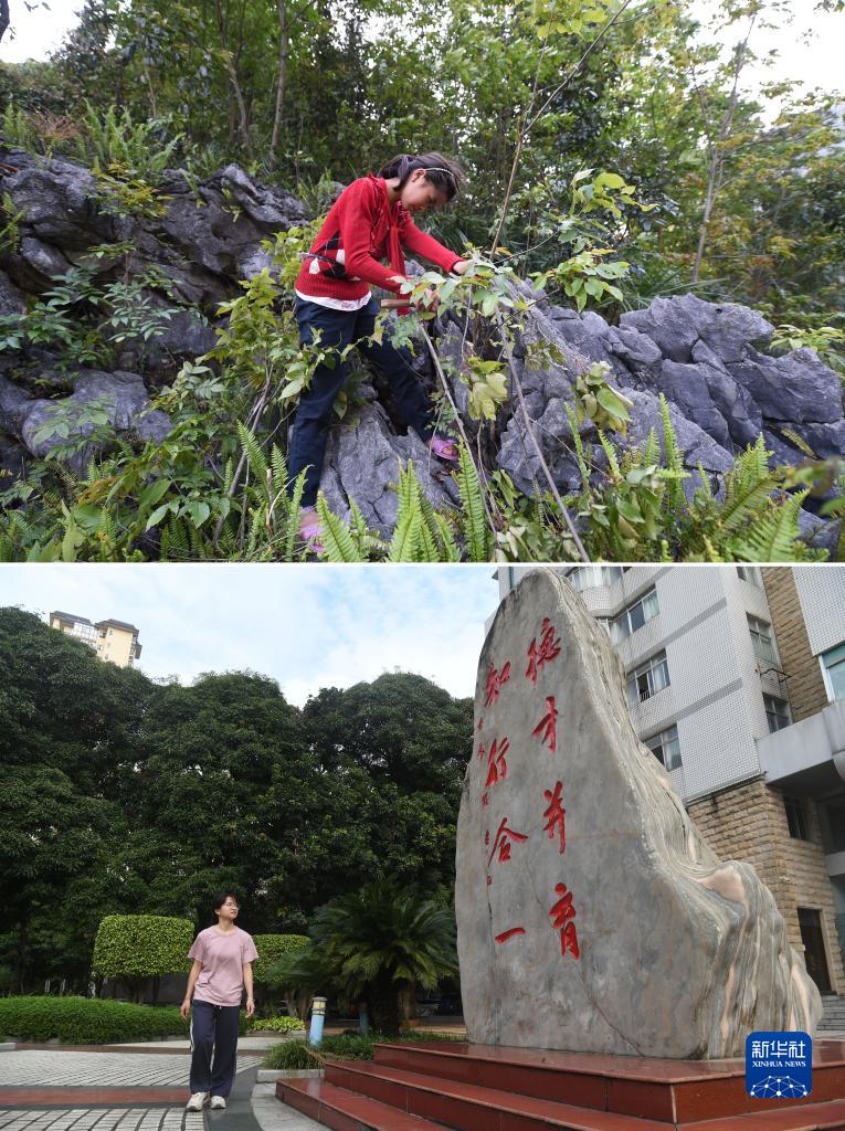 這是一張拼版照片,上圖為:在廣西都安瑤族自治縣拉烈鎮崇業村弄后屯,藍曉萍放學回家后在山上一邊放羊一邊砍柴(2015年4月14日攝);下圖為:在廣西南寧師范大學,藍曉萍走在校園里(2023年9月26日攝)。