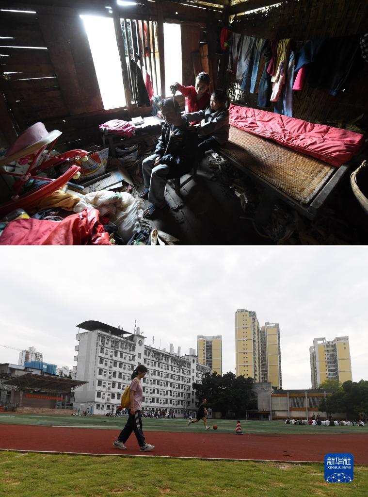 這是一張拼版照片,上圖為:在廣西都安瑤族自治縣拉烈鎮崇業村弄后屯,藍曉萍和妹妹藍云萍在照顧父親(2015年4月14日攝);下圖為:在廣西南寧師范大學,藍曉萍走在校園里(2023年9月26日攝)。