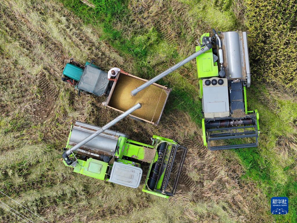 金秋時節,湖南省瀏陽市沿溪鎮種植的中稻迎來收獲季,當地農民搶抓農時收割水稻,稻田里一派繁忙景象。