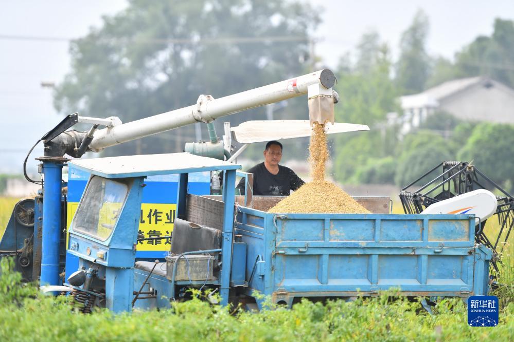 金秋時節,湖南省瀏陽市沿溪鎮種植的中稻迎來收獲季,當地農民搶抓農時收割水稻,稻田里一派繁忙景象。