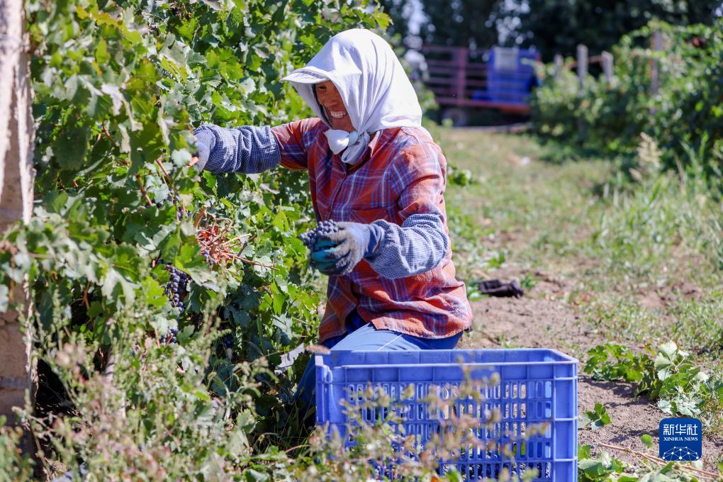 9月26日,在新疆吐魯番市鄯善縣,工人在采摘釀酒葡萄。