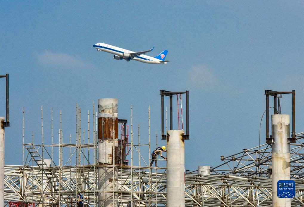 9月27日,一架飛機從廣州白云國際機場T3航站樓施工現場上空飛過。