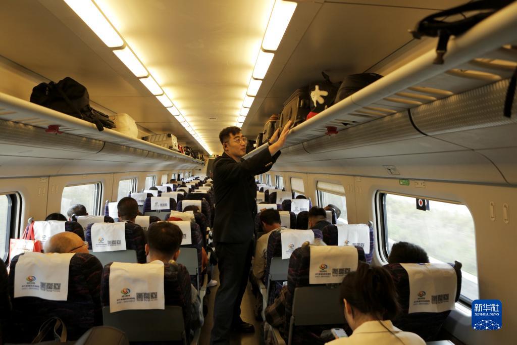 9月27日,乘務員在哈爾濱開往佳木斯的動車上為旅客整理行李。