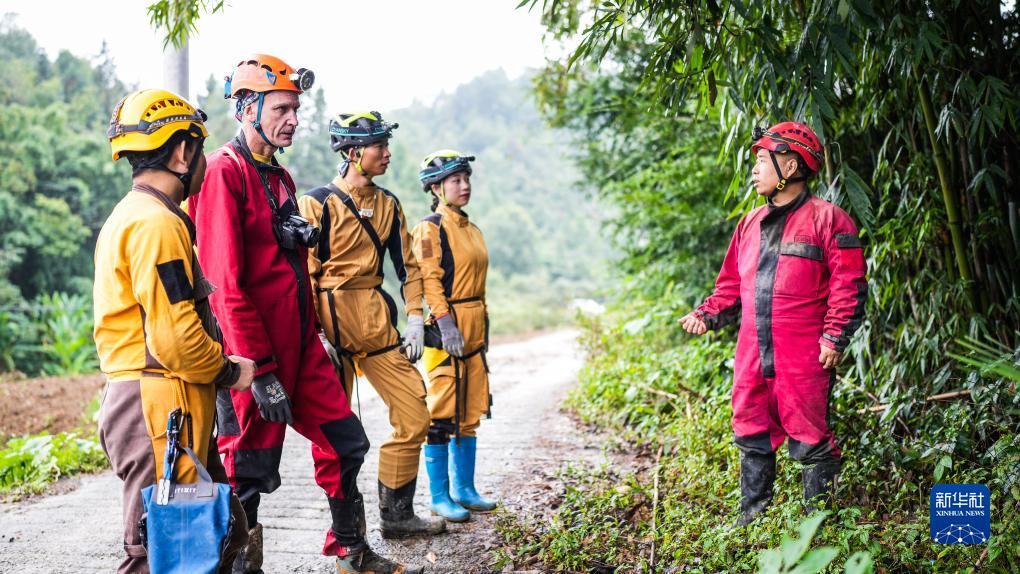意大利專家(左二)和貴州省山地資源研究所科考隊員整隊完畢準備開始探洞(9月24日攝)。