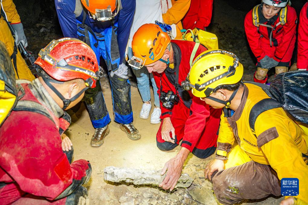 意大利專家和貴州省山地資源研究所科考隊員在雙河洞一處支洞中進行科考(9月22日攝)。