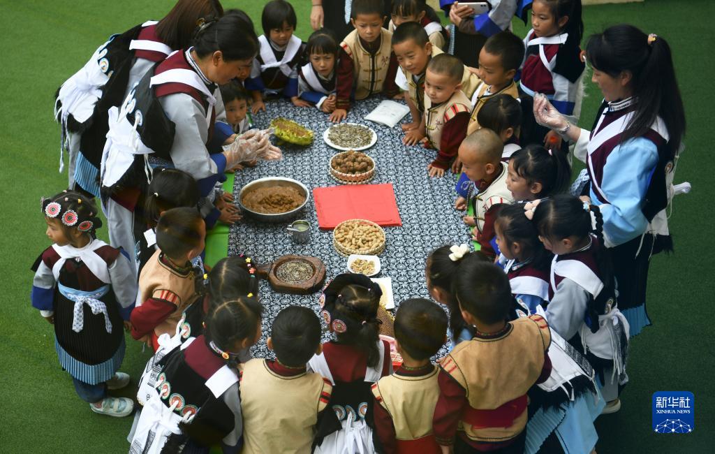 9月27日,云南省麗江師范高等??茖W校附屬新苗幼兒園的小朋友在老師的指導下制作月餅。