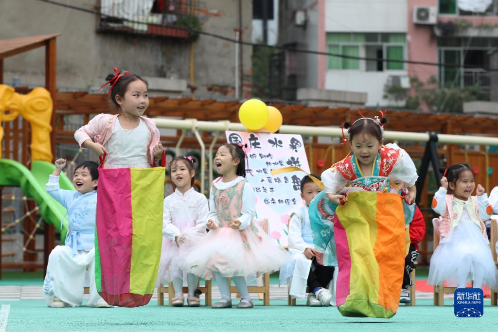 9月27日,四川省廣安市武勝縣迎賓幼兒園的小朋友穿上跳袋玩“嫦娥奔月”的游戲。