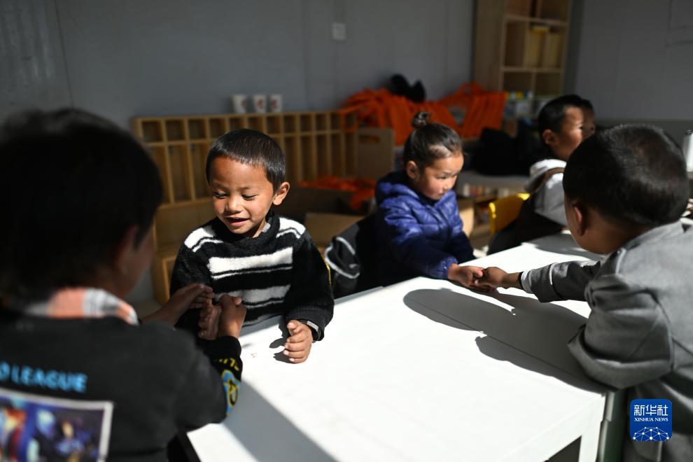 在青海省玉樹藏族自治州曲麻萊縣秋智鄉布甫村陽光幼兒園,普松東周(左二)和伙伴們在教室內玩耍(9月14日攝)。