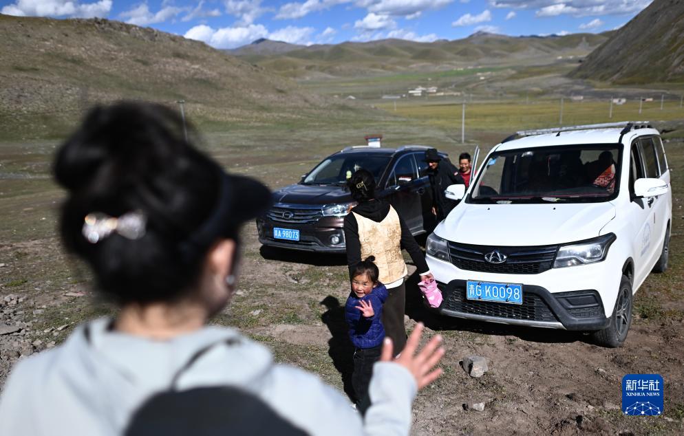 在青海省玉樹藏族自治州曲麻萊縣秋智鄉布甫村陽光幼兒園,孩子們在放學后與老師告別(9月14日攝)。