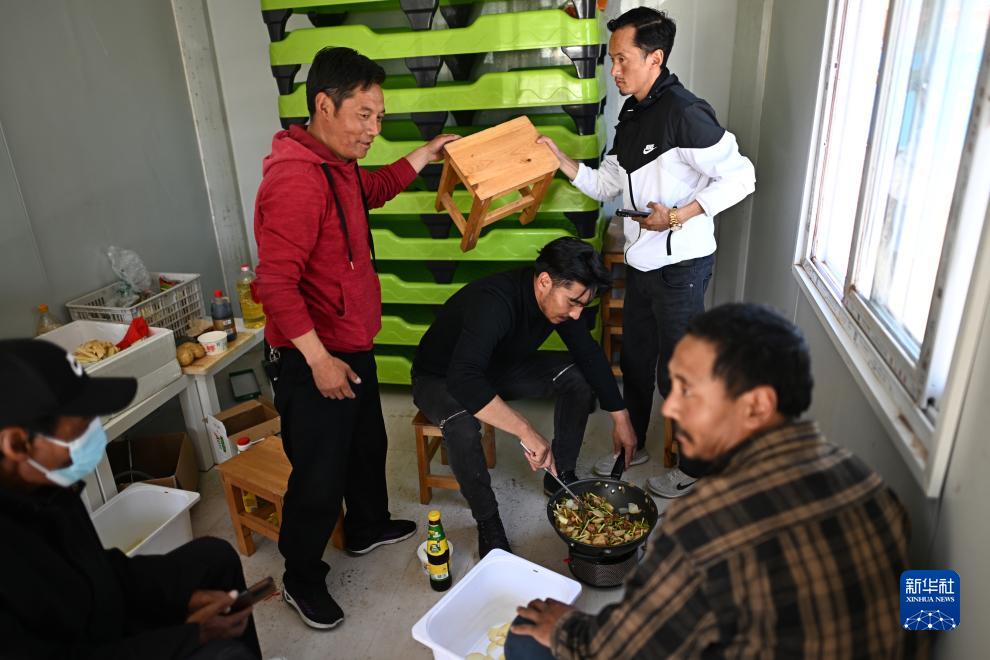 在青海省玉樹藏族自治州曲麻萊縣秋智鄉布甫村陽光幼兒園,秋智鄉幼兒園副園長才仁戰斗(左三)在板房內為孩子們準備午餐(9月14日攝)。