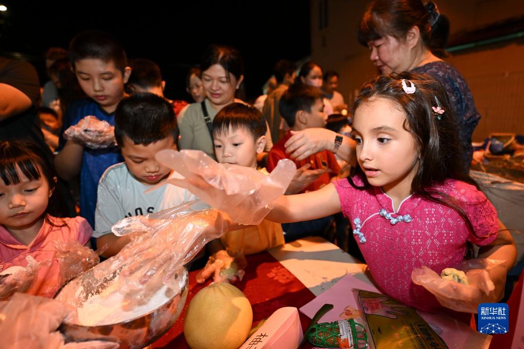9月27日,在馬來西亞馬六甲州丹絨吉寧舉辦的中秋晚會上,兒童參加制作月餅活動。