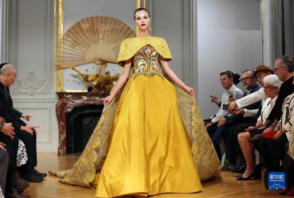 9月27日,模特在法國巴黎中國文化中心舉辦的“恭王府服飾秀”上展示設計師勞倫斯·許創作的恭王府系列高定服裝。