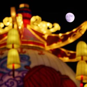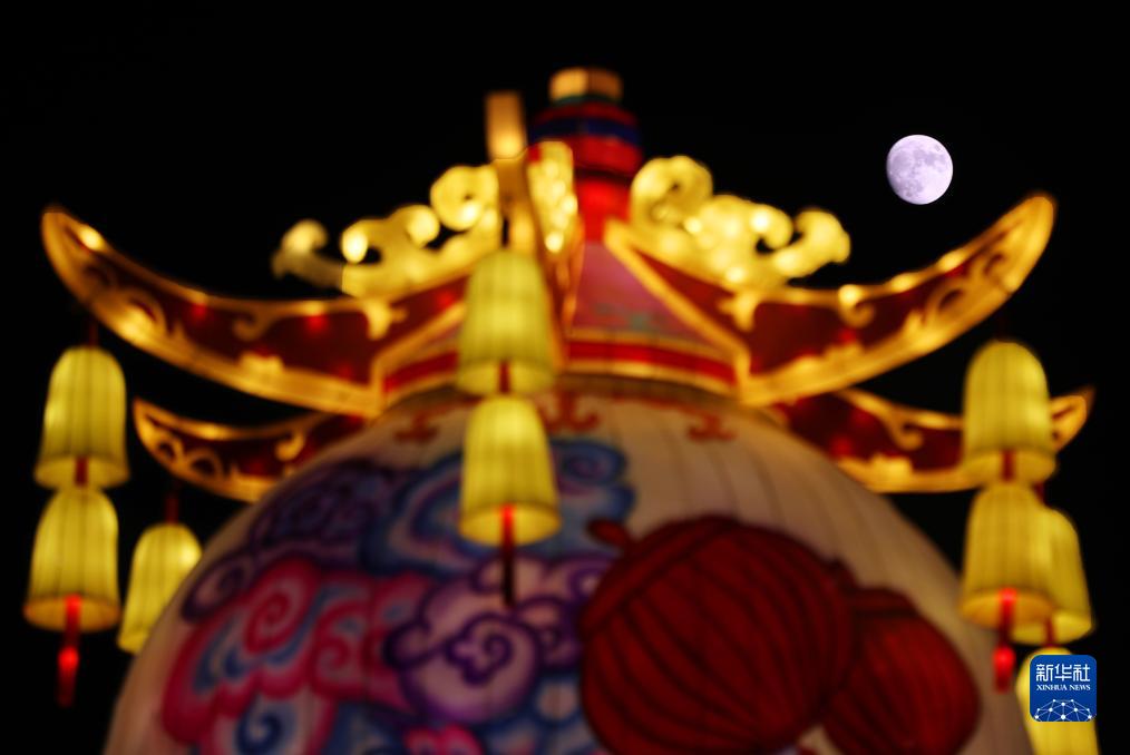 9月27日,一輪明月鑲嵌在南岳祝融彩燈藝術展上空。
