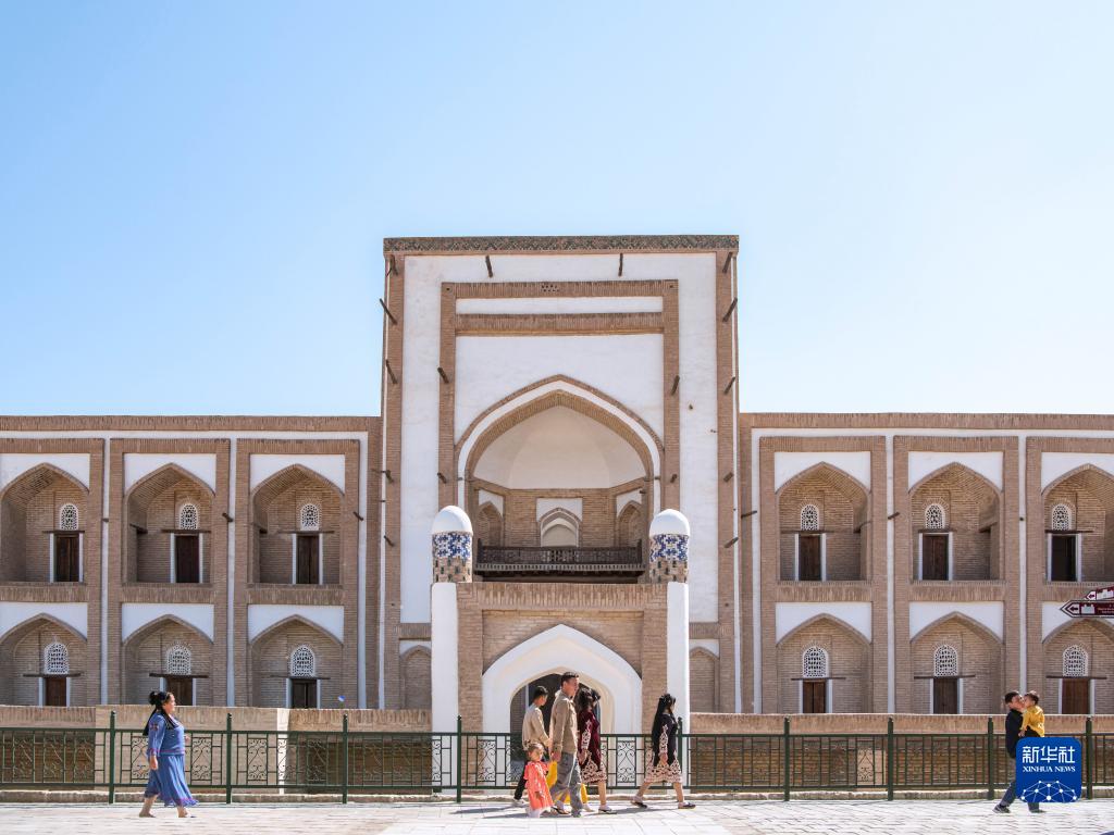 9月22日,在烏茲別克斯坦花拉子模州的希瓦古城,人們從修復一新的的阿米爾·圖拉經學院前走過。