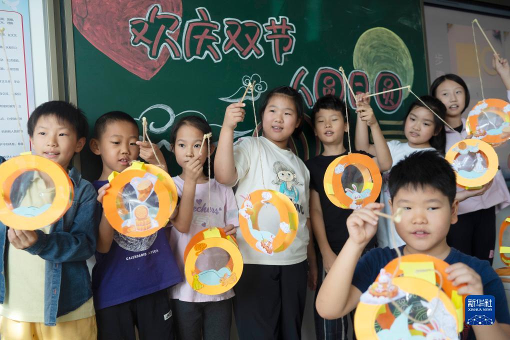9月28日,在北京西城區的北京第二實驗小學涭水河分校,小學生們展示自己制作的“玉兔花燈”。