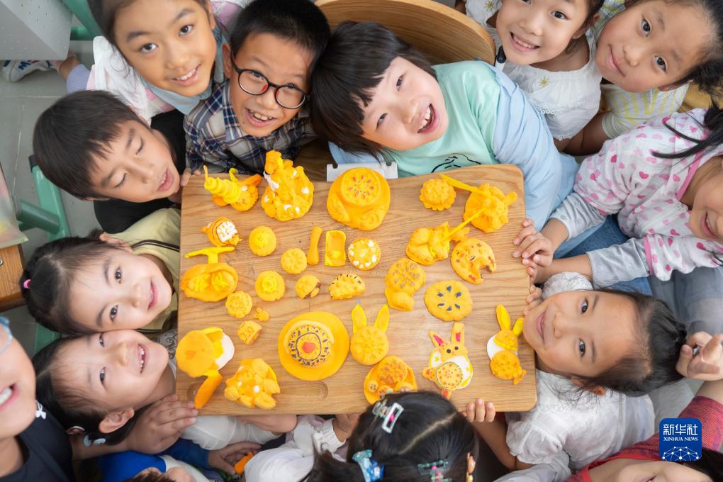 9月28日,在北京西城區的北京第二實驗小學涭水河分校,小學生展示各種奇思妙想的“粘土月餅”。