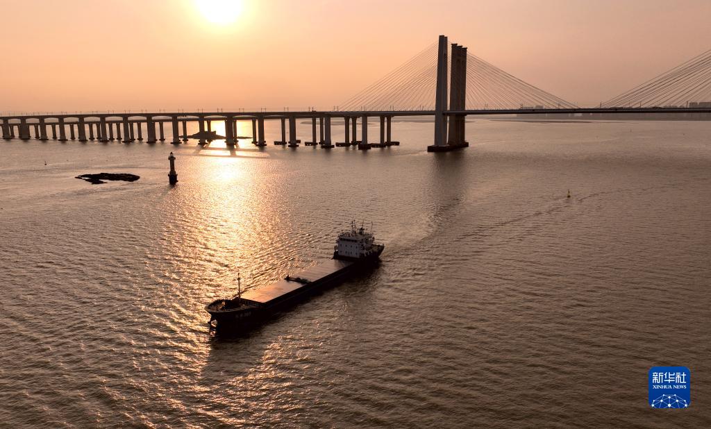 一艘貨輪緩緩穿過福廈高鐵泉州灣跨海大橋(9月18日攝,無人機照片)。