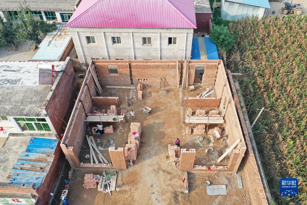 河北保定涿州市刁窩鎮刁四村一處受損房屋重建現場(9月26日攝,無人機照片)。