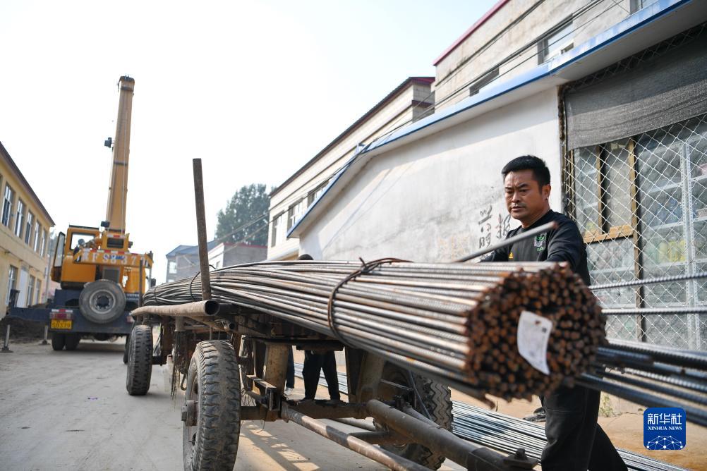 9月26日,工人在河北保定涿州市刁窩鎮刁四村一處受損房屋修復現場搬運鋼筋。