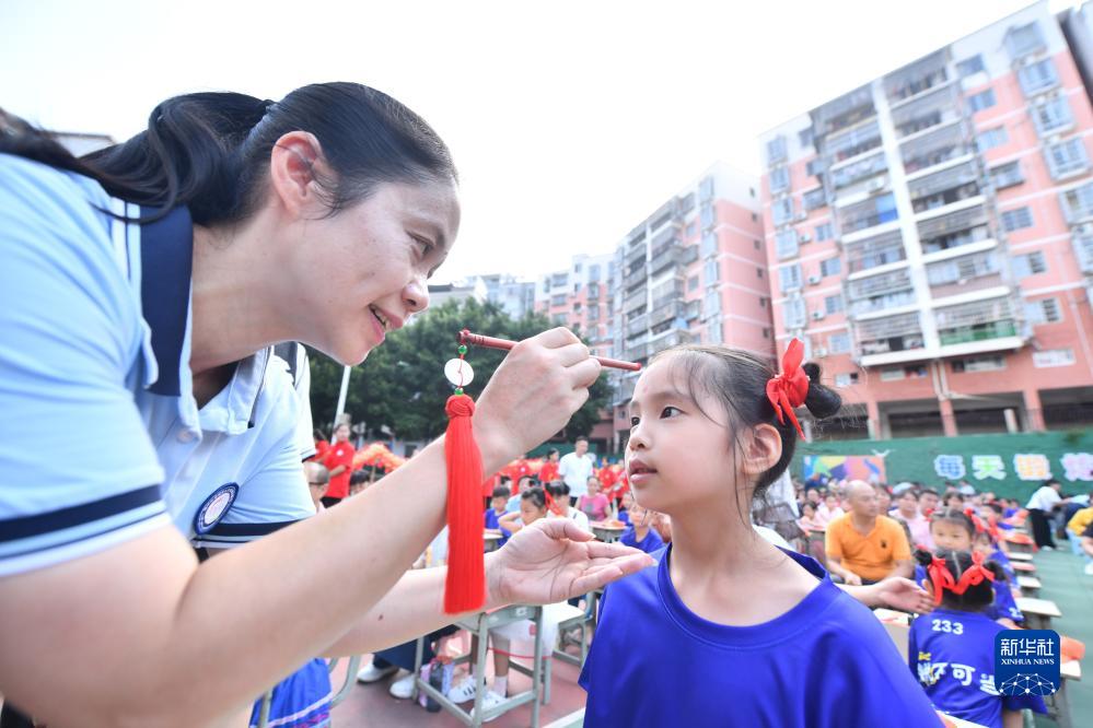 9月28日,梧州市龍圩區龍圩中心小學老師為一年級新生點朱砂啟智。