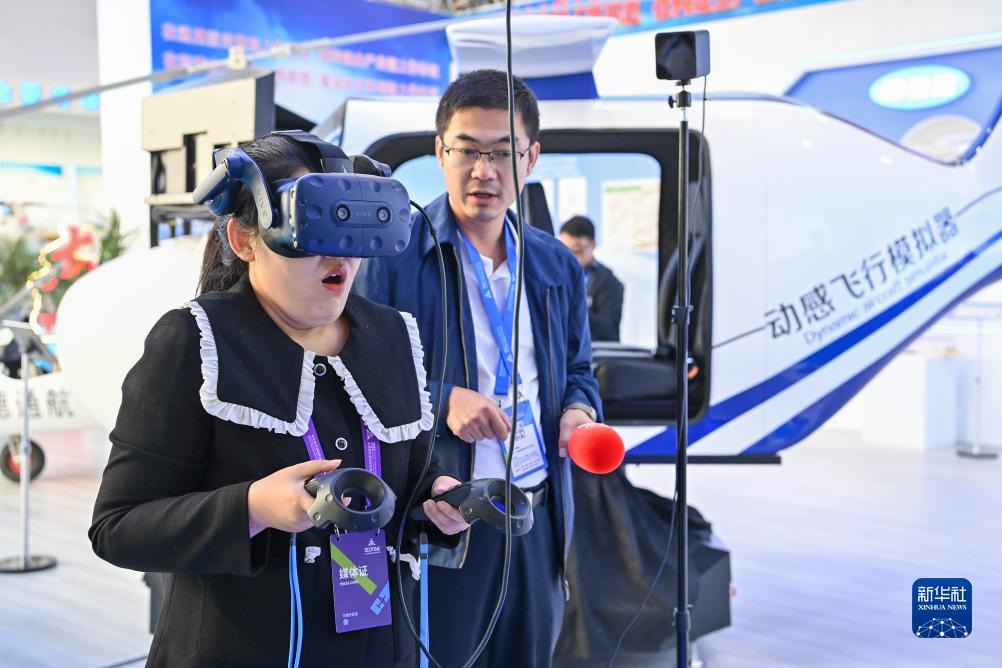 9月28日,一名媒體工作人員在2023太原國際通用航空博覽會上體驗VR機務教學系統。