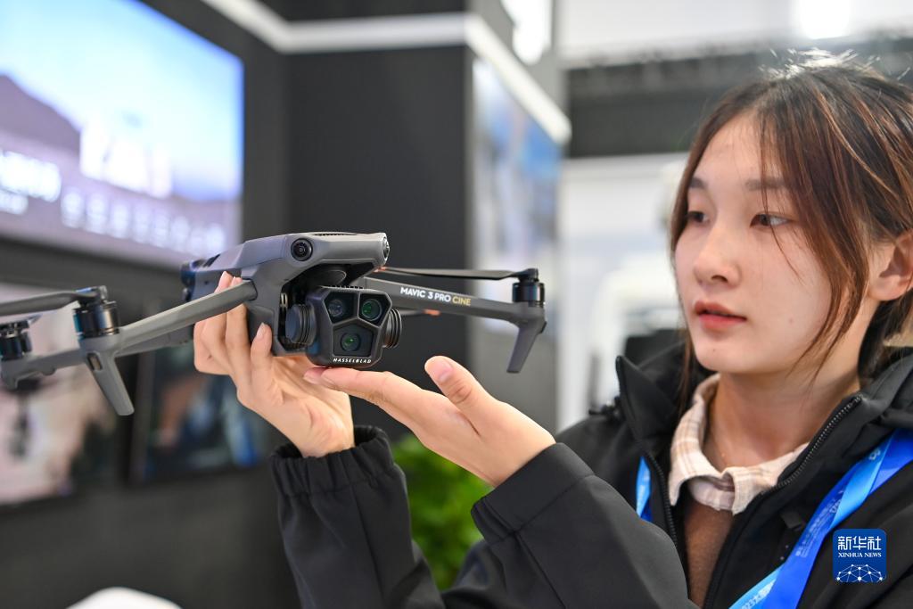 9月28日,在2023太原國際通用航空博覽會上,一名參展商工作人員展示一款無人機。