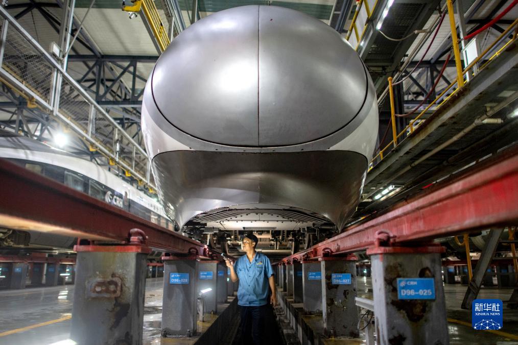 馬耀鋒在動車組車底巡檢(9月26日攝)。