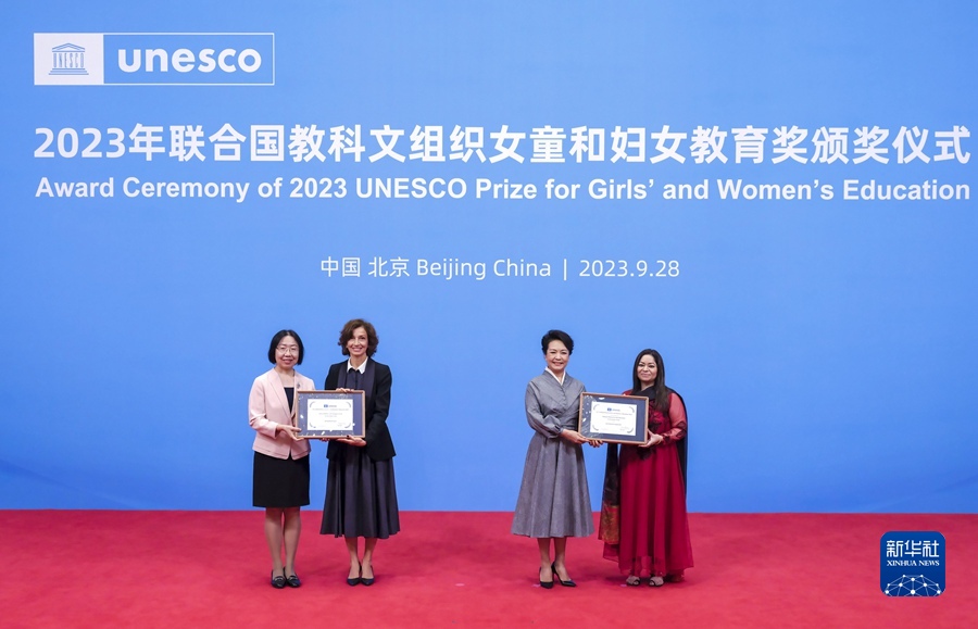 9月28日上午,國家主席習近平夫人、聯合國教科文組織促進女童和婦女教育特使彭麗媛在北京同聯合國教科文組織總干事阿祖萊共同出席2023年聯合國教科文組織女童和婦女教育獎頒獎儀式并分別發表致辭。這是彭麗媛和阿祖萊共同為獲獎的中國兒童少年基金會和巴基斯坦女童教育聯盟代表頒獎。新華社記者 丁林 攝