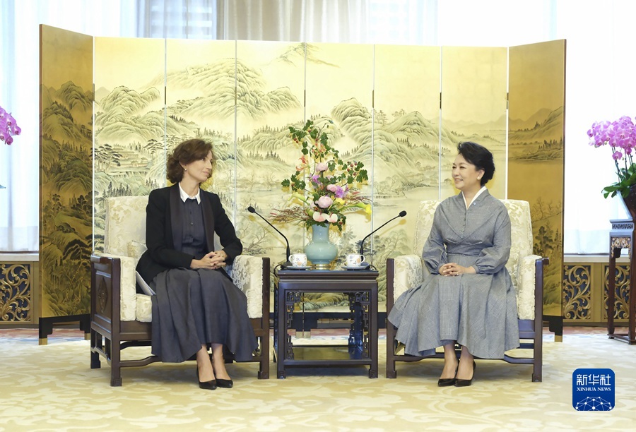 9月28日上午,國家主席習近平夫人、聯合國教科文組織促進女童和婦女教育特使彭麗媛在北京同聯合國教科文組織總干事阿祖萊共同出席2023年聯合國教科文組織女童和婦女教育獎頒獎儀式并分別發表致辭。這是頒獎儀式前,彭麗媛會見阿祖萊。新華社記者 丁林 攝
