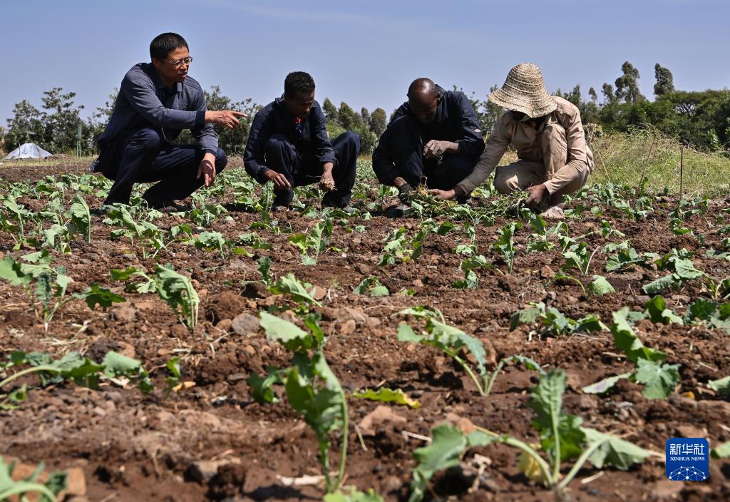 9月27日,在位于厄立特里亞阿斯馬拉的農業技術援助項目示范地,中國援厄第三期高級農業專家組油料作物專家周成(左一)指導當地農戶種植油菜。