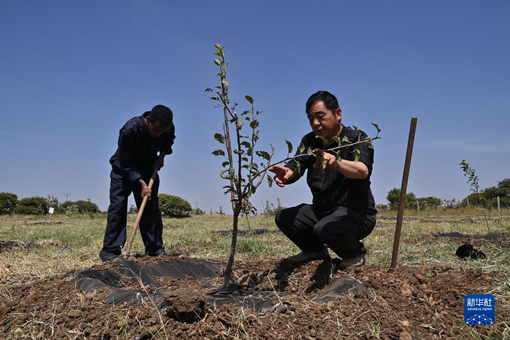 9月27日,在位于厄立特里亞阿斯馬拉的農業技術援助項目示范地,中國援厄第三期高級農業專家組果樹作物專家王力(右)與當地農戶共同進行蘋果樹苗的田間管理。